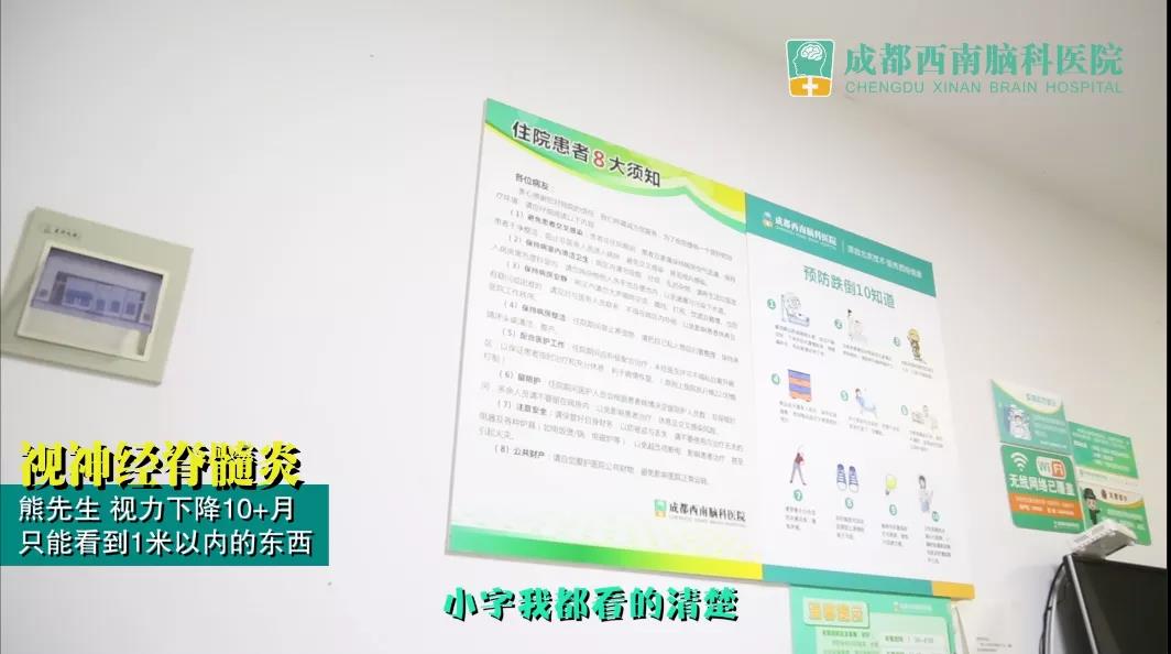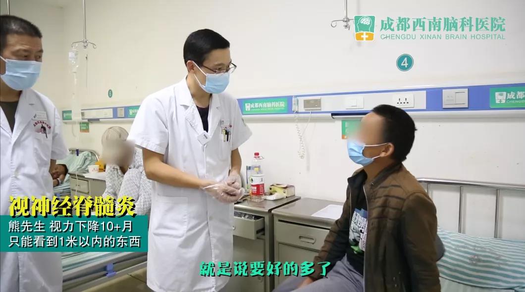 熊先生就因为这个病在10个多月前无明显诱因出现双眼视力进行性下降,并伴有视物模糊,只能看到1米以内的东西。3个月前在我院住院治疗期间,诊断为视神经脊髓炎谱系疾病。这次来院复查,熊先生的视力恢复很好,坐在床上看远处墙上公告的小字都一清二楚了,患者对治治疗果很满意。