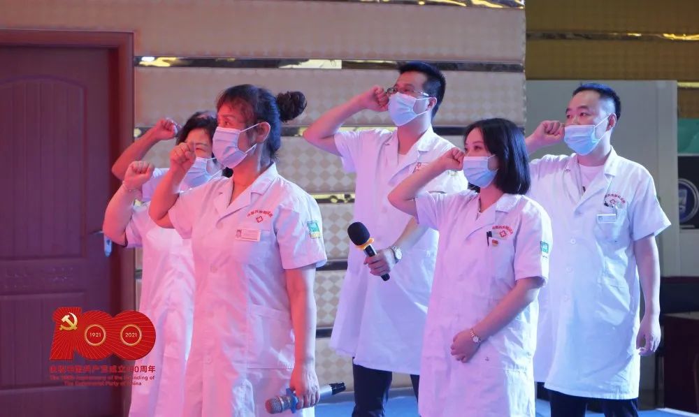 面对鲜艳的国旗,大家的歌声铿锵有力。慷慨激昂的旋律流入每一个人的心底,深深表达了对伟大祖国的无限忠诚,包含了医务工作者对党忠诚、听党指挥的崇高理想和坚定信念。