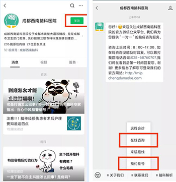 01、关注微信公众号「成都西南脑科医院」→「联系我们」→「预约挂号」,也可以点击「在线咨询」,免费咨询更多疾病的相关问题。