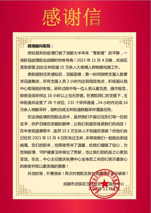 天气渐寒,突如其来的疫情打破了成都大半年来“零新增”的平静,新一轮疫情阻击战瞬时吹响号角。上一次脑科出征,还是去年12月。今年11月4日,西南脑科人再次积极响应武侯区紧急部署,奔赴疫情防控一线,为玉林街道15万余人开展核酸检测排查工作。