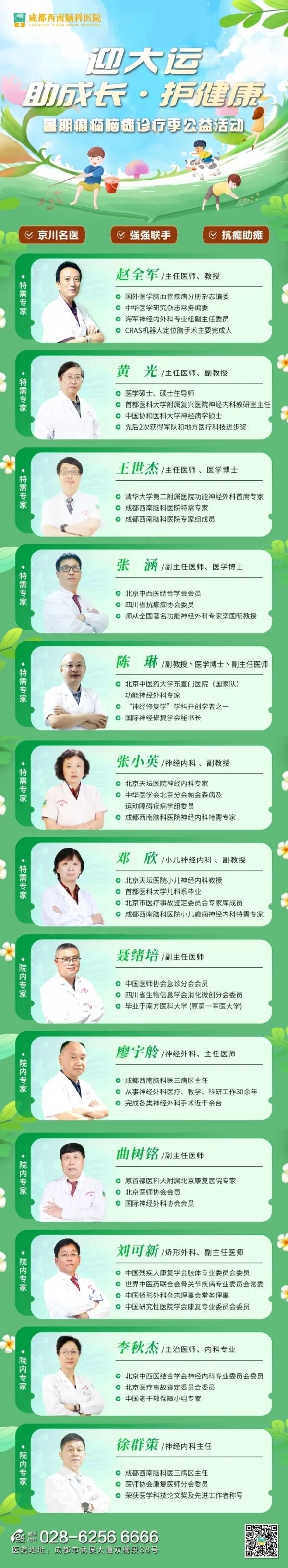 在大运会来临之际,我院联合成都市残疾人福利基金会, 开展“迎大运 助成长 护健康”暑期癫痫脑瘫诊疗季公益活动,每周邀请北京脑科坐诊,实行单病种限价收费,给予每一位癫痫、脑瘫、发育迟缓的患儿实质性的帮助,用爱心帮扶祖国花朵,用医术助力儿童成长,提高患儿及其家庭对癫痫脑瘫的正确认识,树立治疗的信心,让他们早日摆脱疾病的阴影!