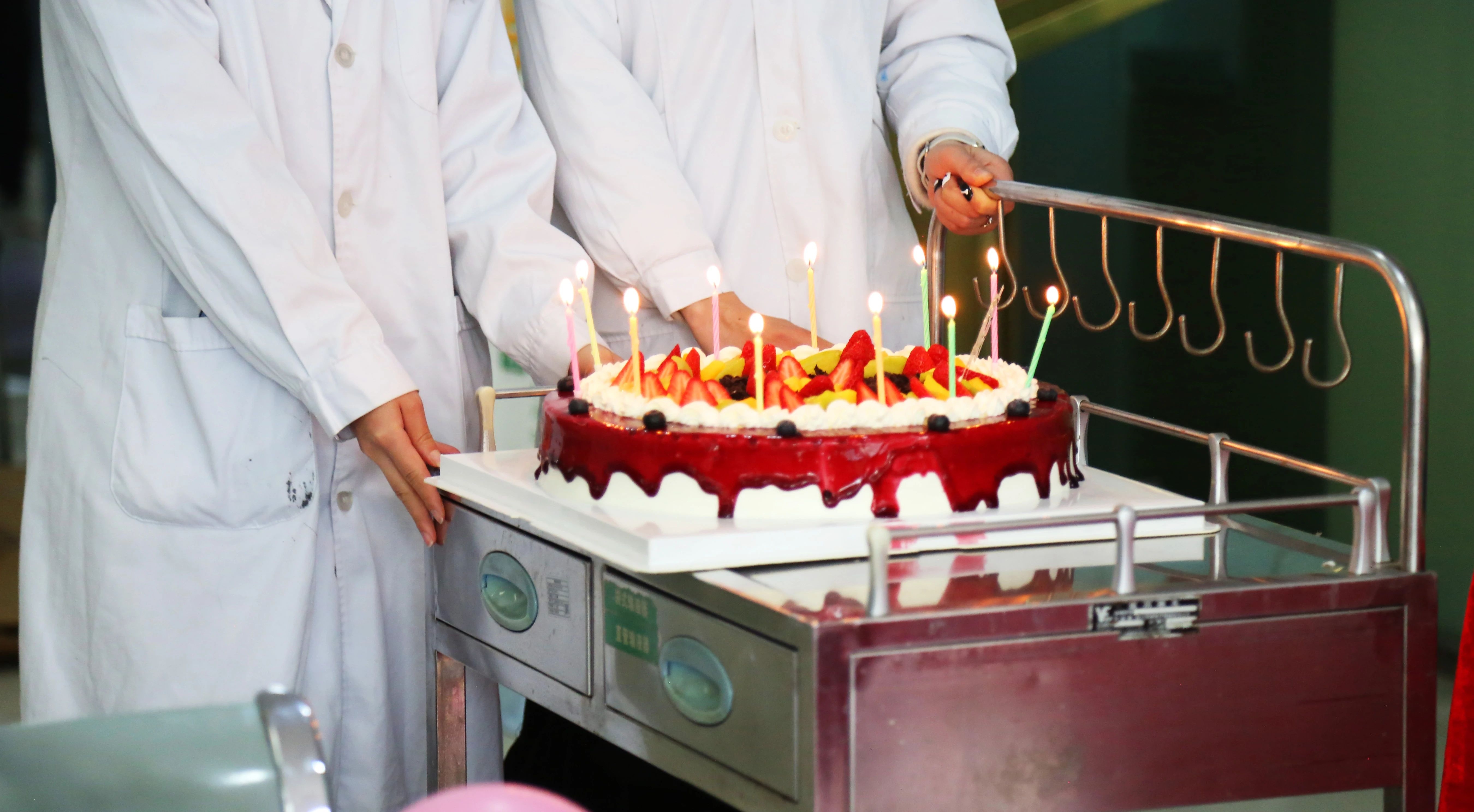 院长讲话后,生日歌再次响起,工作人员推着点好蜡烛的生日蛋糕缓缓走来。蛋糕上五颜六色的蜡烛摇曳生辉,为现场增添了一抹温馨的色彩。