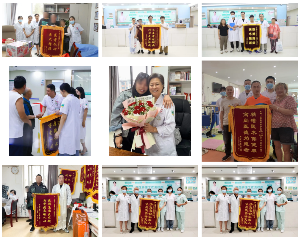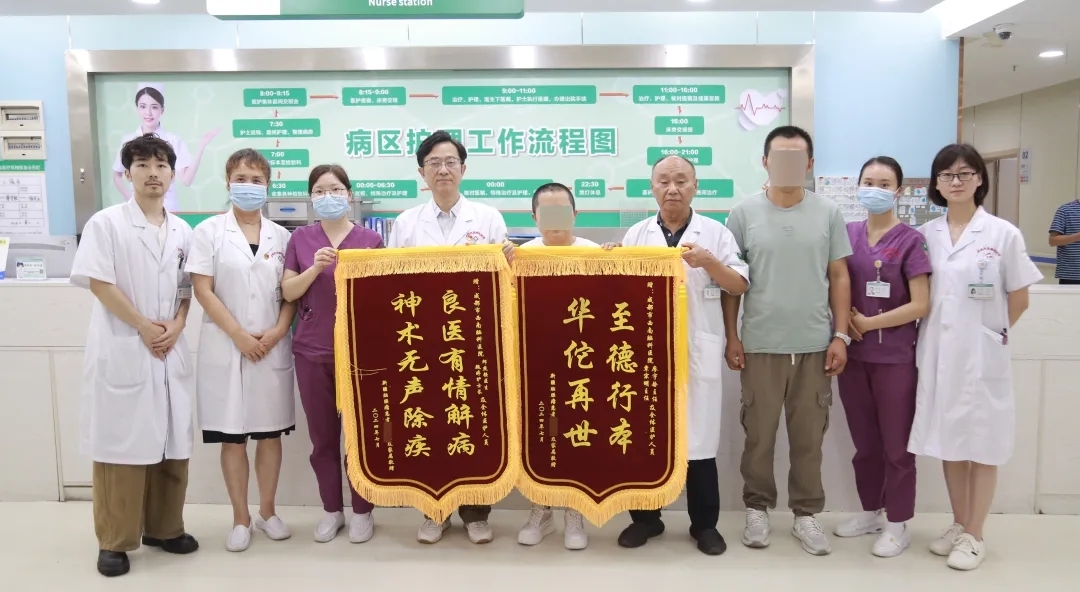 王女士今年55岁,去年2月体检发现颅内占位病变,一直未接受治疗。直到病情加重,辗转来到我院,确诊为脑膜瘤。由覃宗明主任、廖宇舲主任为其手术后,在主管医生邱燕强、护士长魏婷,及全体医护人员的精心照顾下,病情明显好转。为表感谢,特送来两面锦旗。这是对我们最大的肯定,也是对我们最大的激励!