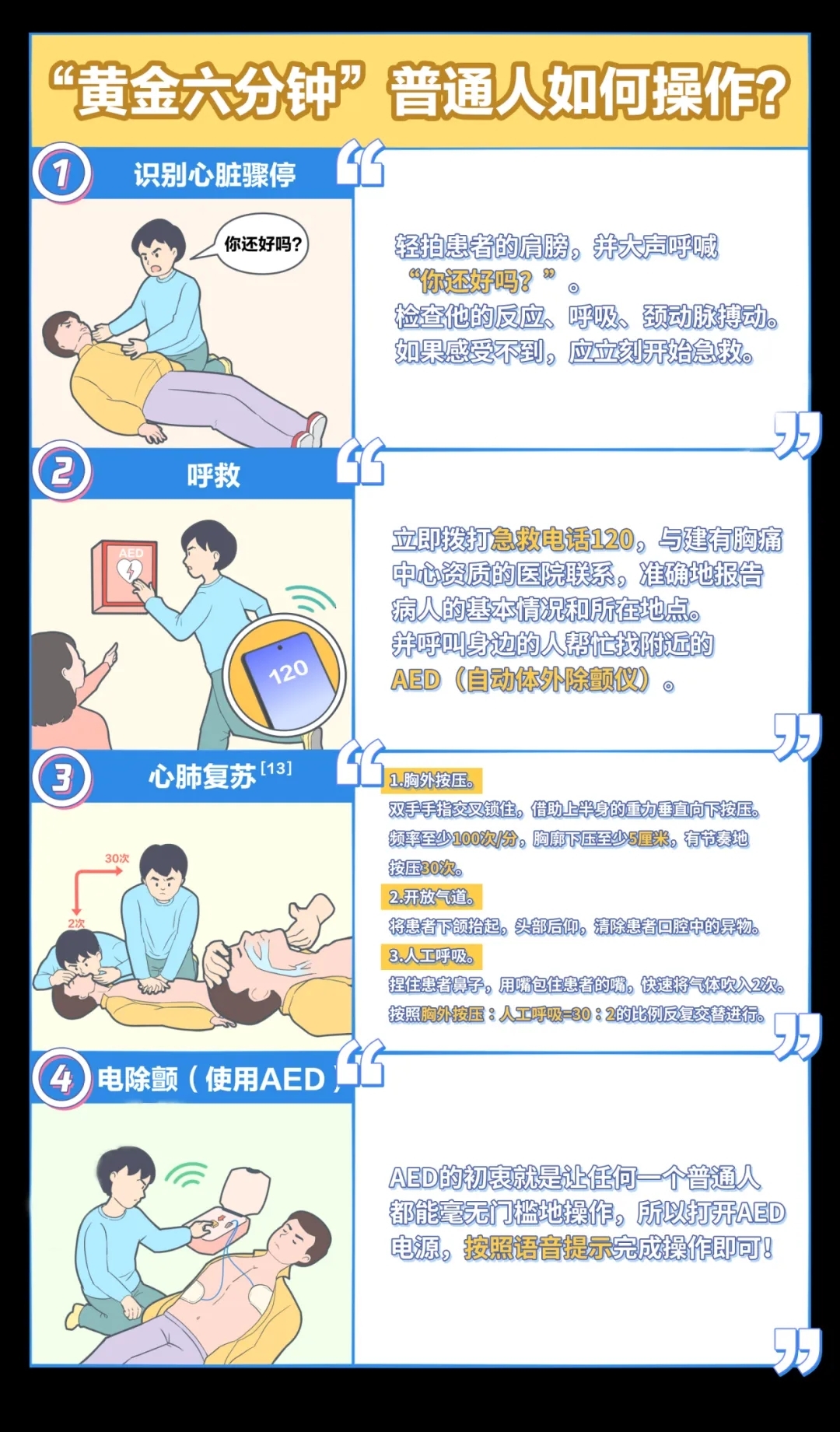 “黄金六分钟”就是在“心跳停止后最初的六分钟”内进行心肺复苏和使用自动体外除颤器的这个黄金时间窗口