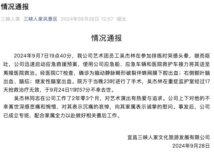 近日,湖北省宜昌市的5A级景区——湖北三峡人家风景区发布了一则情况通报:一名21岁男演员排练时发病,抢救多天后仍不幸身亡。此事经媒体报道,引发关注。