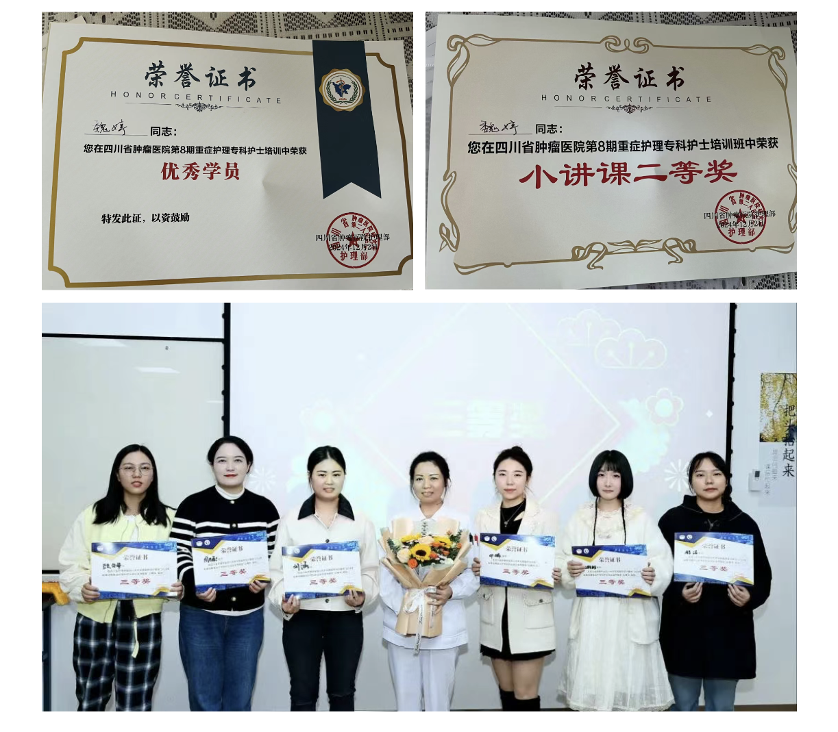 为此,9月2日~12月2日,监护室护士长魏婷前往四川省肿瘤医院,参加了重症护理专科护士培训,荣获“优秀学员”及“小讲课二等奖”。