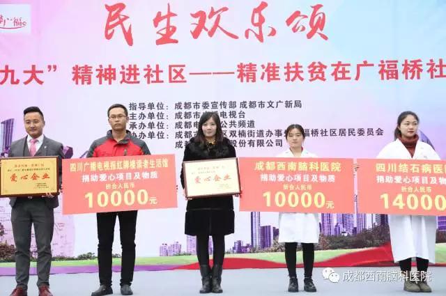 为了贯彻落实党的十九大精神,为了让更多的贫困居然感受到社会的温暖,由成都市委宣传部、成都市文广新局指导,成都市广播电视台主办的民生欢乐颂 “十九大”精神进社区——精准扶贫在广福桥社区活动在昨天下午圆满落幕。成都西南脑科医院作为支持单位也受邀参与了这次活动,在捐献爱心的同时还在现场开展了医疗志愿援助活动。