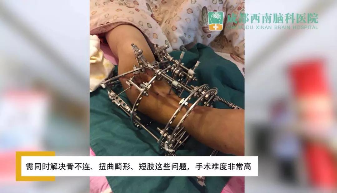 经会诊后,成都西南脑科医院骨科主任、脑瘫矫形外科副主任医师刘可新主任,亲自为患者廖女士进行了伊里扎洛夫手术,同时解决了右腿畸形、骨不连、短肢等三大手术问题。术后效果非常好,唱歌跳舞都可以,患者廖女士很满意,她说,手术后肢体改善有80%以上,形象上的改善让她觉得很开心,很快乐;治疗后自信十足,觉得自己与旁人并无不同。患者廖女士丈夫说,(这个)矫形手术改善巨大,(她)唱歌跳舞样样都行。