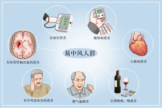 脑卒中的主要危险因素包括高血压、糖尿病、血脂异常、房颤、吸烟、大量饮酒、不合理膳食、超重或肥胖、缺乏运动、心理因素、脑卒中家族史等。脑卒中及高危人群在应对寒潮天气时,应做好保暖措施,尽量减少外出,必要外出时要注意头部、胸背、脖子和四肢的保暖。同时,注意休息,适度增加体育锻炼,提升抵抗力,关注气候变化。
