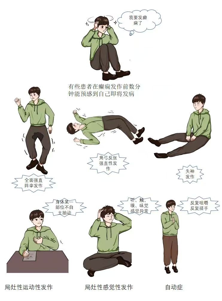 轻则出神发呆、点头不止,重则突然意识丧失,发生摔倒、四肢抽搐、口吐白沫、牙齿紧闭、两眼上翻、口中怪叫、大小便失禁,甚至窒息死亡。