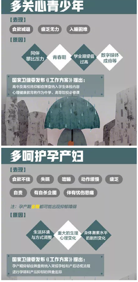 “三低六无”的表现:“三低”:情绪低落、思维迟缓、精力下降;“六无”:无趣、无望、无助、无能、无力、无用。