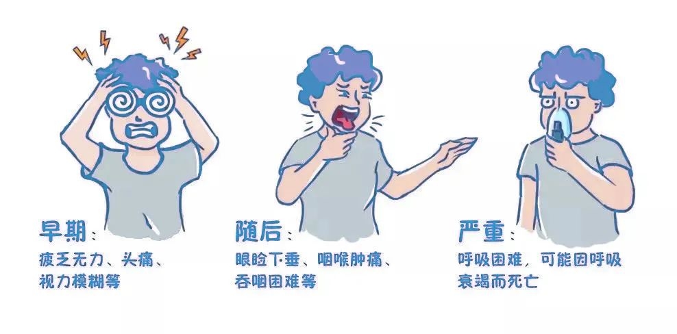 中毒症状严重者还会出现张嘴、咀嚼、吞咽困难、吐词不清、声音嘶哑或者失声、咽干,感觉咽喉部发紧、流口水。甚至出现胸闷、憋气、呼吸困难、肢体瘫痪。