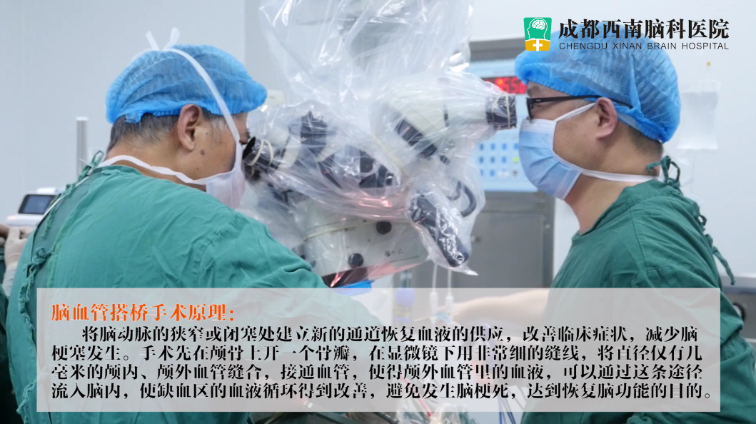 手术将颅内外血管接通,相当于重新建一条高速公路,绕过狭窄路段,连接两头。搭桥手术必须在高倍显微镜下进行,对显微外科技术要求很高。在脑血管搭桥时,为了进行血管吻合,需要在直径1毫米左右的脑血管上缝合。手术时使用的缝合线比人的头发丝还要细,肉眼下几乎看不见缝合线的存在,只能在显微镜放大数十倍的情况下操作。