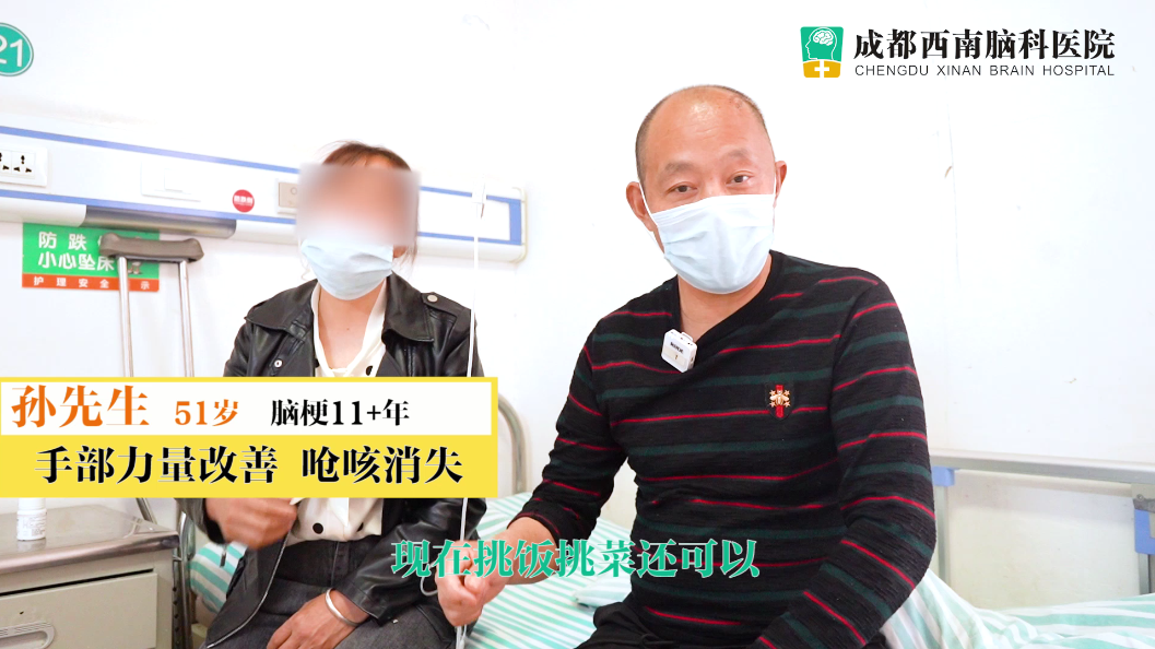 孙先生第一次脑梗发作是在11+年前,长期的高血压引发右侧肢体乏力,全身发汗,流口水,在广州某医院治疗后症状改善。6+年前再次出现右侧肢体乏力,言语不清,广州某院治疗后右上肢症状改善,右下肢行走拖曳。2+月前孙先生第三次脑梗发作,手脚无力,说话喝水呛咳,为求进一步治疗来到成都西南脑科医院。