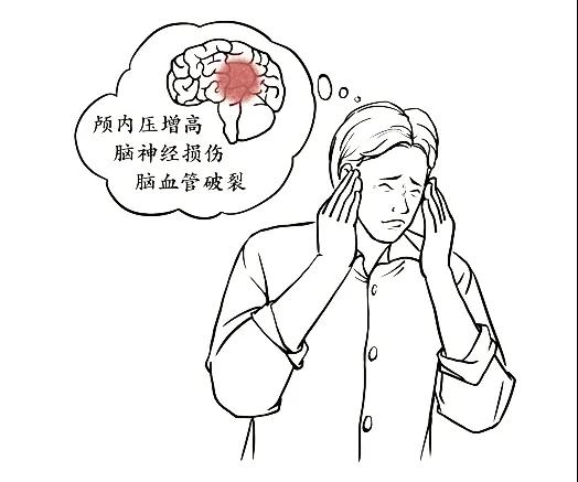 其中,头痛、呕吐是较常见的症状,多由高颅压或脑积水引起。头痛加剧时,呈喷射样呕吐,如上图所示。如果颅内压持续升高,会引发脑疝,极为凶险!