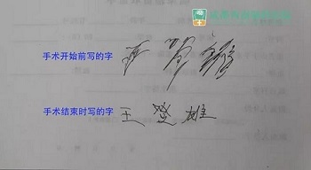 手术开始15分钟时,患者抖动减轻。在手术30分钟后,左侧肢体停止了抖动,拿东西也不再抖动了。写字平稳,写出的字趋于正常。