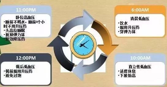 体位性低血压容易出现在晨起时及进餐后,高血压容易出现在平卧时,特别是夜间及凌晨。