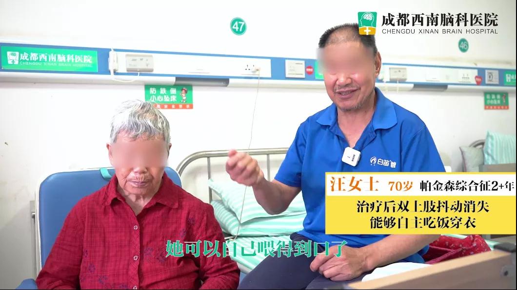 确诊帕金森综合征后,我院对汪奶奶服用的药物进行了调整,配合康复训练等一系列治疗,汪奶奶双上肢抖动晃动的症状明显改善,能够自行吃饭穿衣,行走自如了,老两口对治治疗果非常满意。