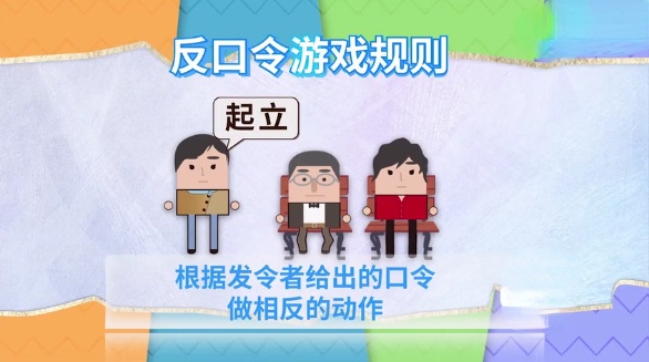 一人报口令,剩余其它人根据发令者给出的口令做出相反的动作,如所报口令为“向左转”,则应该做出“向右转”的动作,做错即将淘汰,坚持到最后的人即为胜者。