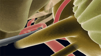 麻醉后,在耳后发髻线的位置做一个2-3厘米的切口,在显微镜的操作下,找到压迫神经的血管,用隔离垫片把它隔开,一旦责任血管被隔离,产生刺激的根源就消失了,三叉神经的高兴奋性就会随之消失。手术不损伤脑组织,不损伤神经,术后不会影响病人的日常生活。